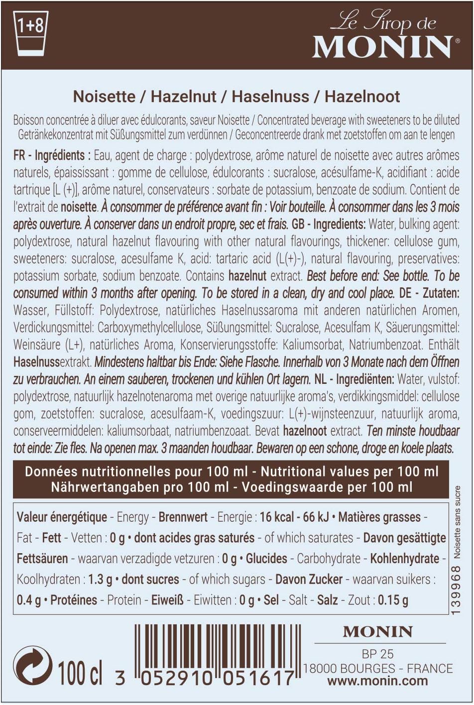 Trusted by professionals and perfect for home use, MONIN Hazelnut Sugar Free Syrup offers a guilt-free way to enjoy your favorite flavored drinks—any time, any way.