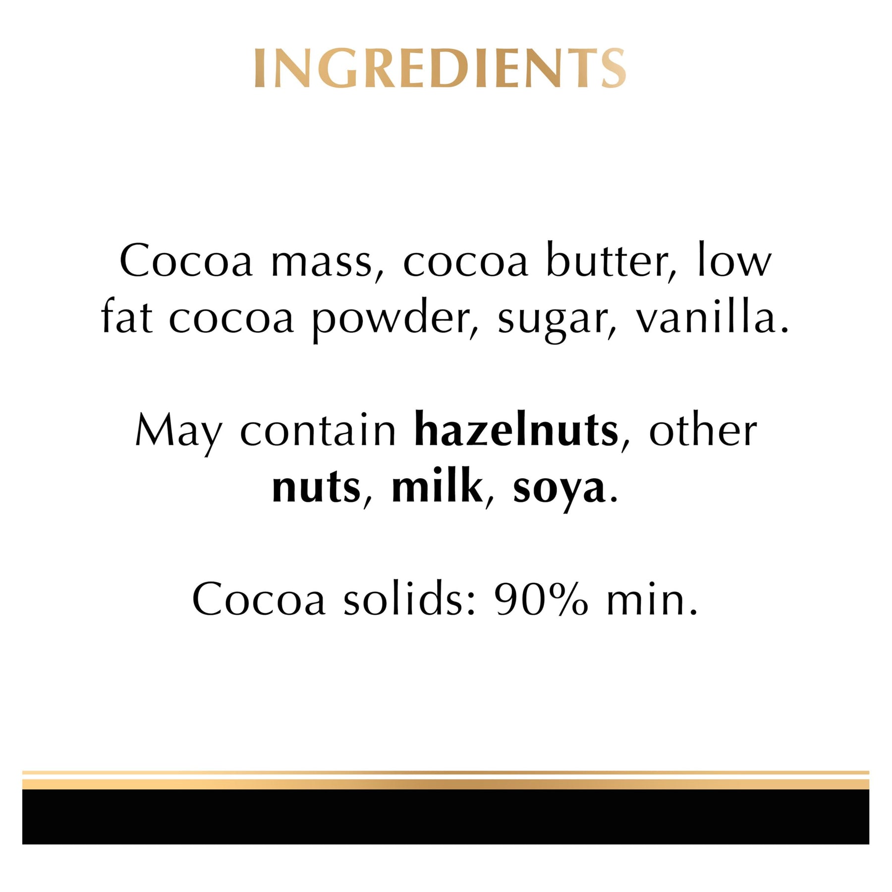 • Ingredients: cocoa mass, cocoa butter, low fat cocoa powder, sugar. May contain hazelnuts, almonds, other nuts, milk and soya.
