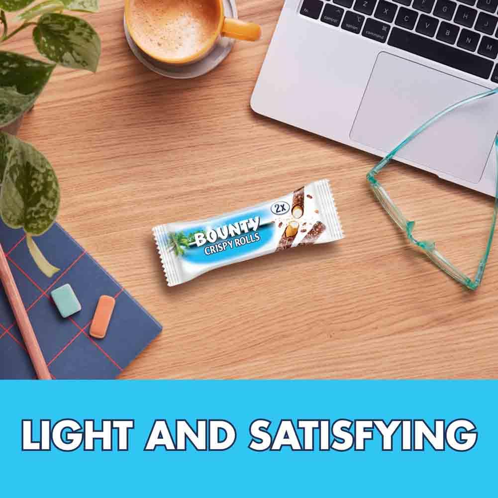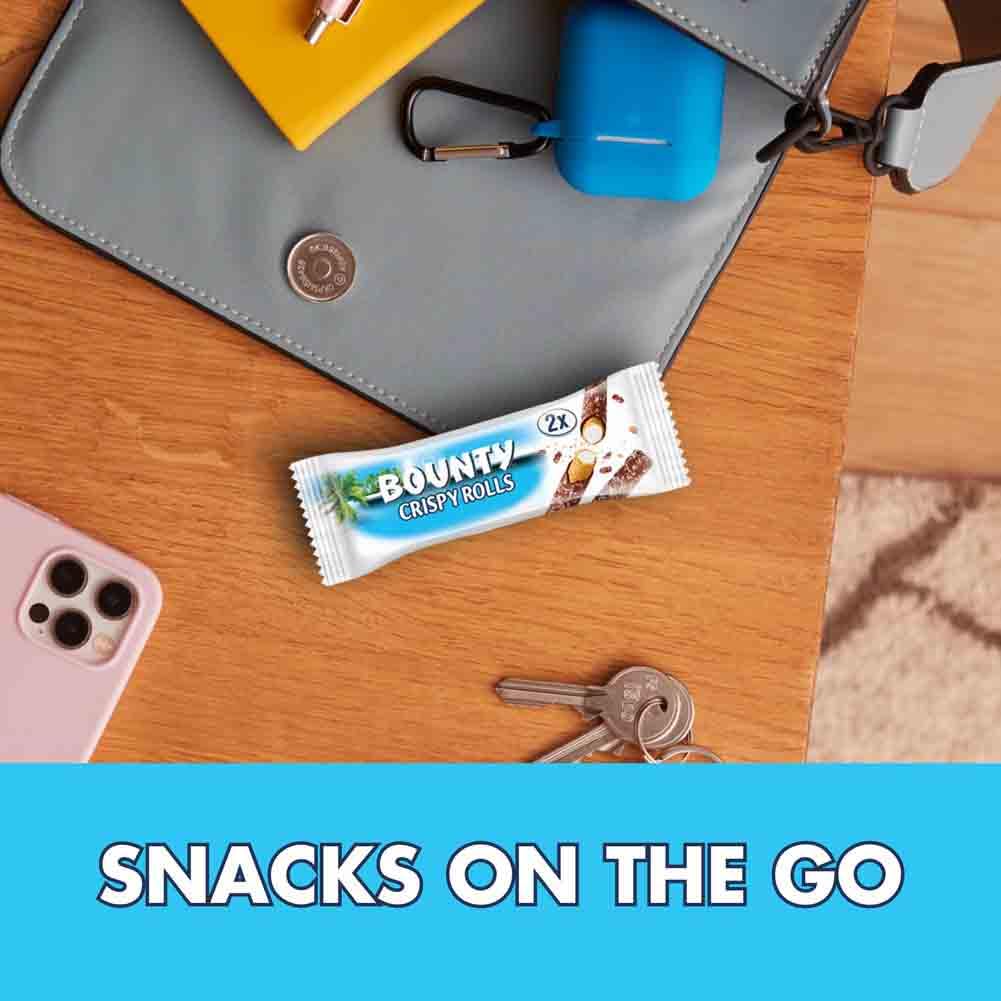 Tempt your tastebuds with Bounty Crispy Rolls, featuring a delicious combination of crispy wafer, coconut-flavoured filling, and smooth milk chocolate rolled into one indulgent treat. Perfect for turning an ordinary moment into a tropical escape, these snack bars are ideal for on-the-go enjoyment during school pick-ups, grocery runs, or a well-deserved break from your meeting agenda.