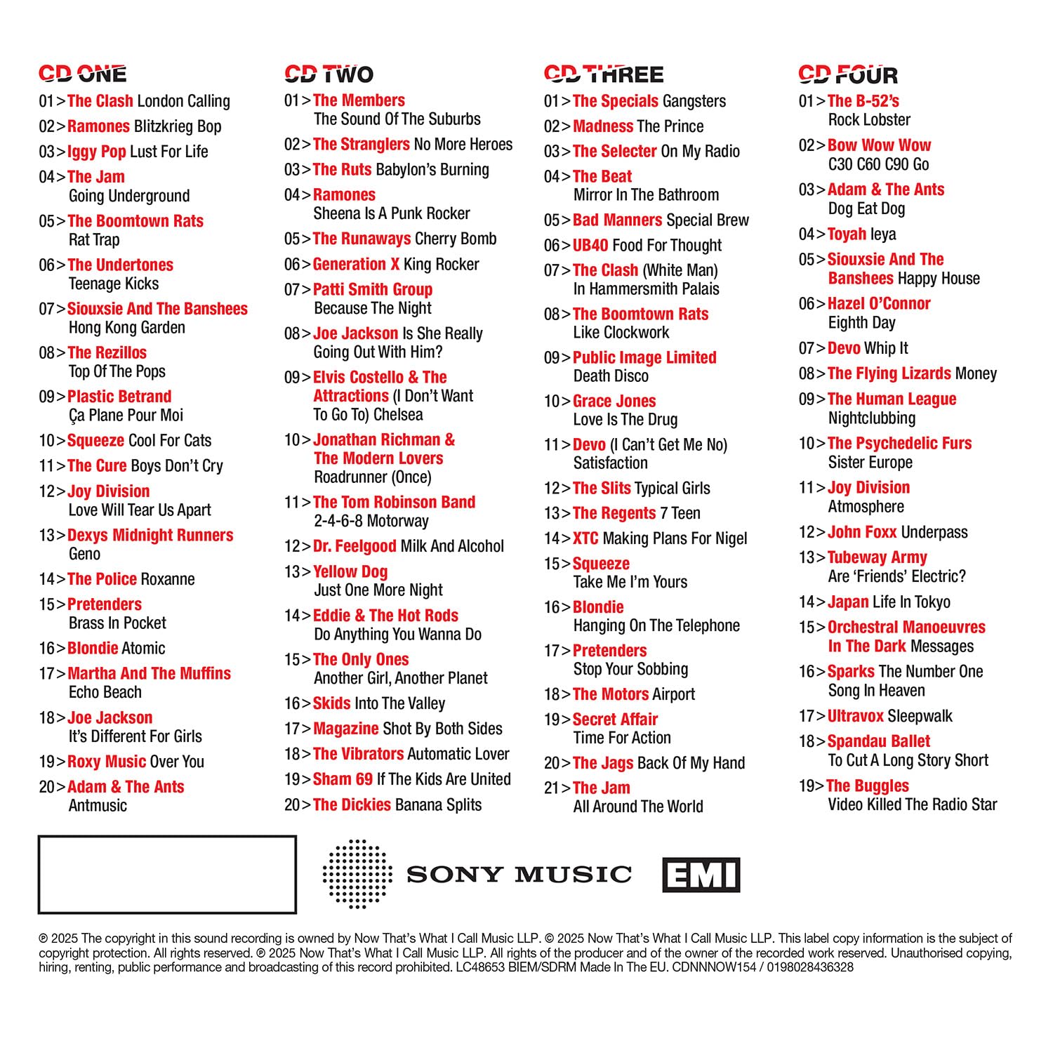 In celebration of one of the most dynamic and diverse periods in music history, NOW presents 'NOW That’s What I Call An Era: The Sound Of The Suburbs' – a special edition 4-CD compilation featuring 80 tracks from 1977 to 1980. This collection captures the rich musical evolution of the era, spanning punk, new wave, reggae, ska, mod, and electronic genres that paved the way for the early 1980s pop revolution. Highlights include The Clash's iconic 'London Calling', The Ramones' punk classics, Iggy Pop, The Jam, and The Boomtown Rats' chart-topping 'Rat Trap'. The Undertones deliver a defining anthem, while Siouxsie And The Banshees begin their influential hit streak. Early breakthroughs from The Cure, Joy Division, Blondie, Squeeze, The Pretenders, and Adam & The Ants showcase the era's creative explosion. Disc 2 opens with The Members' 'The Sound Of The Suburbs', followed by punk energy from The Stranglers, The Ruts, The Runaways, and more. Patti Smith's 'Because The Night', Joe Jackson, Elvis Costello, and Jonathan Richman appear with signature self-penned tracks. The Tom Robinson Band, Dr. Feelgood, Generation X, and The Skids bring anthemic power, closing with Sham 69 and The Dickies' fun take on the 'Banana Splits' theme.