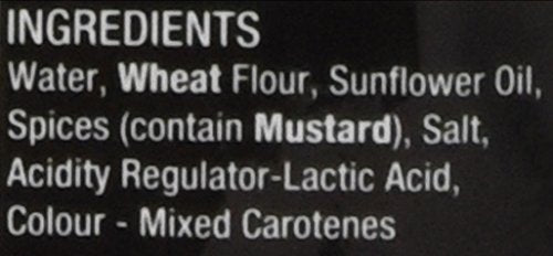 Water, WHEAT Flour, Sunflower Oil, Spices (contain MUSTARD), Salt, Acidity Regulator-Lactic Acid, Colour - Mixed Carotenes.