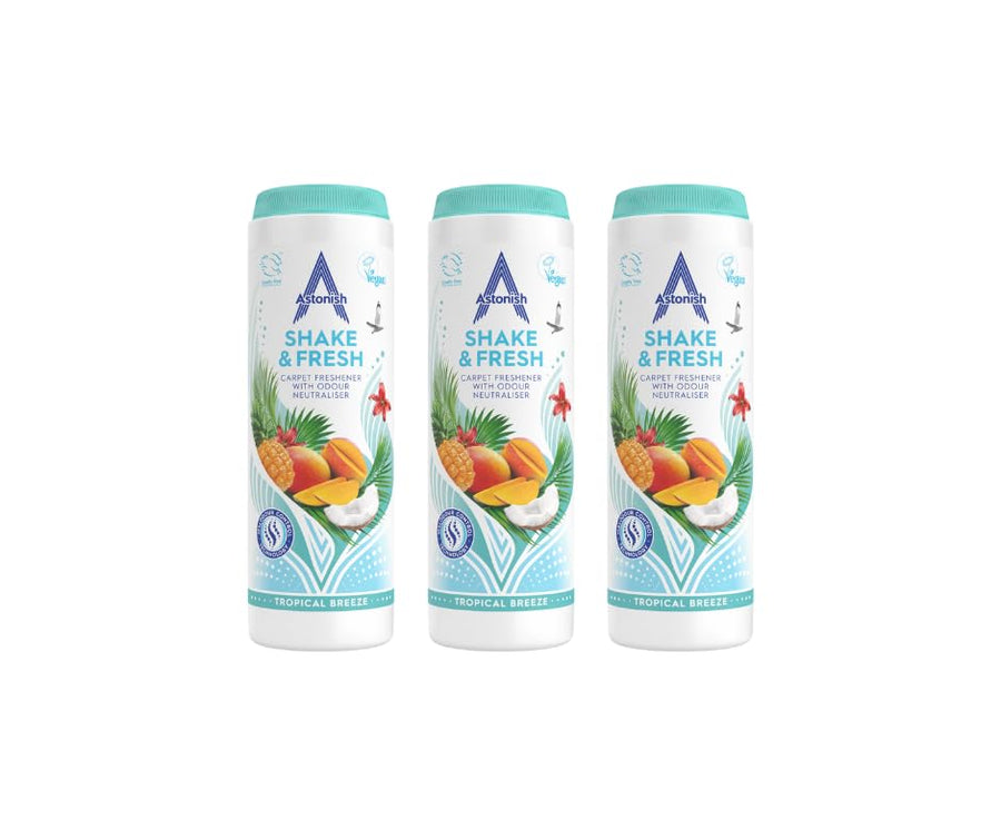 Freshen and revitalize your carpets with Astonish Shake & Fresh Carpet Freshener. Designed to combat everyday odours, this powerful formula uses Malodour Control Technology to neutralize stubborn smells from pets, spills, and general household use, leaving behind a refreshing tropical breeze fragrance.