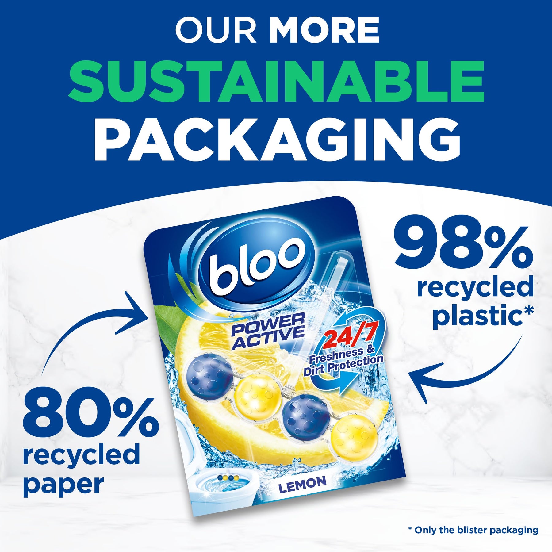 Experience lasting cleanliness, shine, and fresh lemon scent with every flush using Bloo Power Active Rim Blocks.