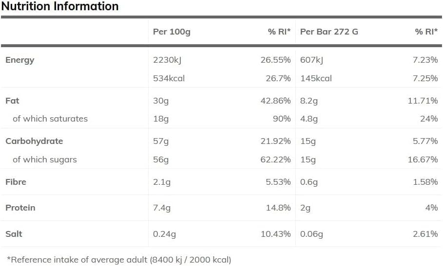 - Ingredients: Milk, sugar, cocoa butter, cocoa mass, vegetable fats (palm, shea), emulsifiers (E442, E476), flavourings