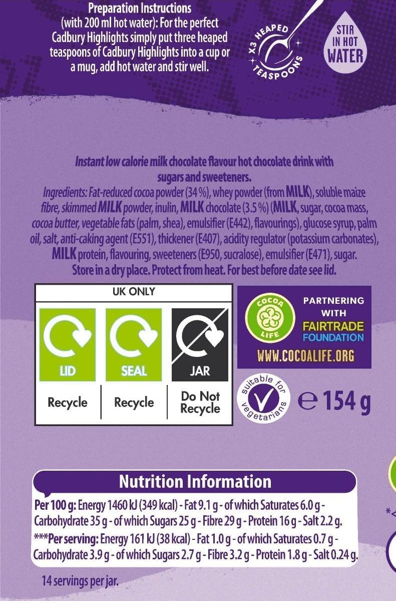Warm up with the rich, creamy taste of Cadbury Highlights Milk Chocolate Hot Drink, a low-calorie indulgence perfect for cozy evenings or an afternoon treat. Made with sustainably sourced cocoa from the Cadbury Cocoa Life program, each sip delivers the classic Cadbury milk chocolate flavour you love, without the guilt.