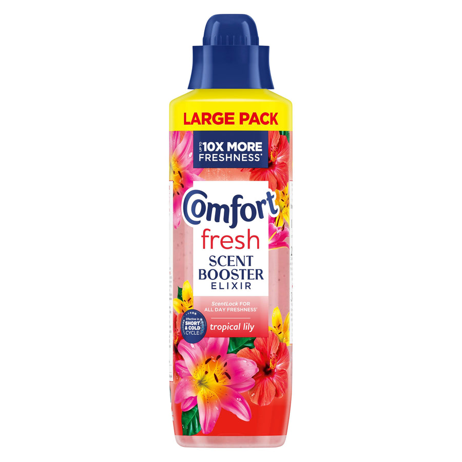 Experience up to 10x more freshness* with Comfort Fresh Tropical Lily Scent Booster Elixir, a bead-infused formula that locks fragrance into every fiber for a long-lasting, luxurious scent. This shimmering elixir delivers an uplifting tropical fragrance with citrus, frangipani, white florals, red fruit, vanilla, brown sugar, and amber notes that last through wear and storage.