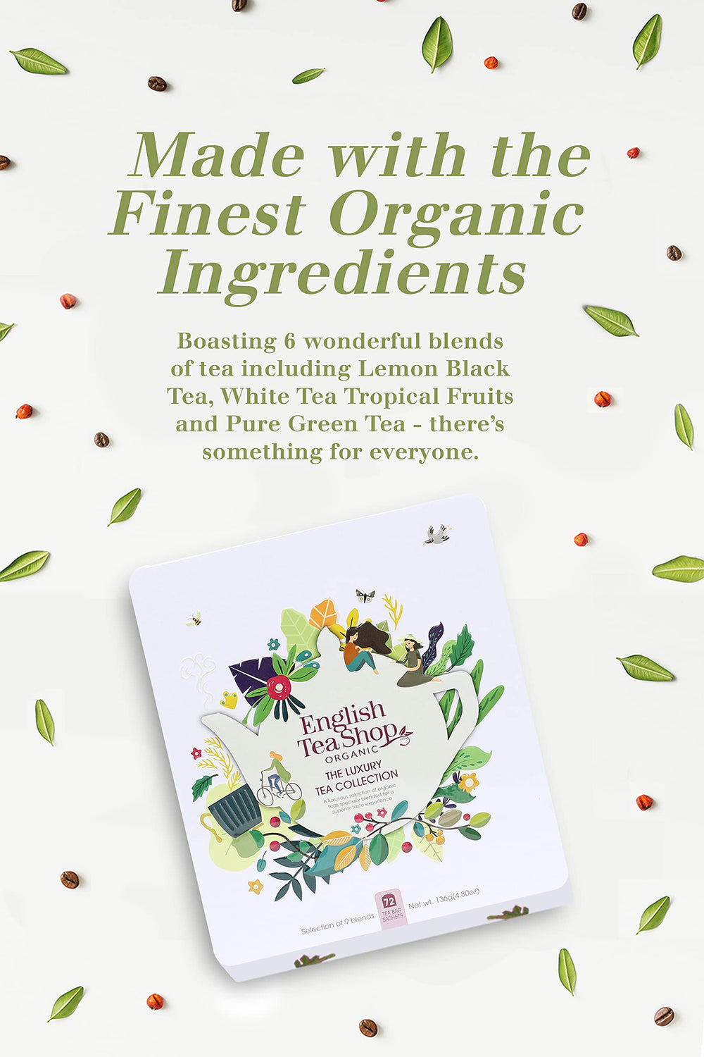 A luxurious selection of organic teas specially blended for a superior taste experience. This carefully curated collection from English Tea Shop offers a delightful range of flavors, perfect for sharing with loved ones or enjoying throughout the day.