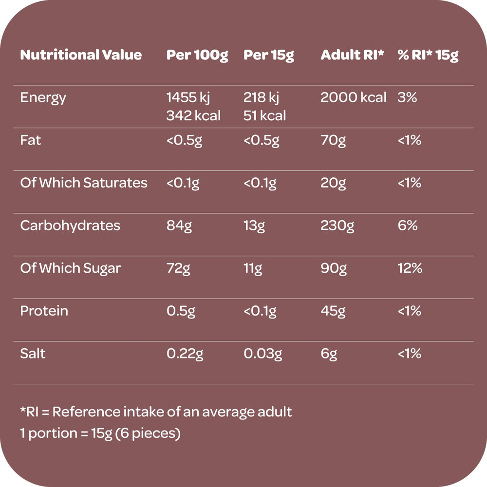 • Ingredients: Glucose-fructose syrup, sugar, water, dextrose, gelling agent (carrageenan), maize starch, hydrolyzed rice protein, stabiliser (polyphosphate), natural vanilla flavour with other natural flavours, colour (calcium carbonate, red beetroot)