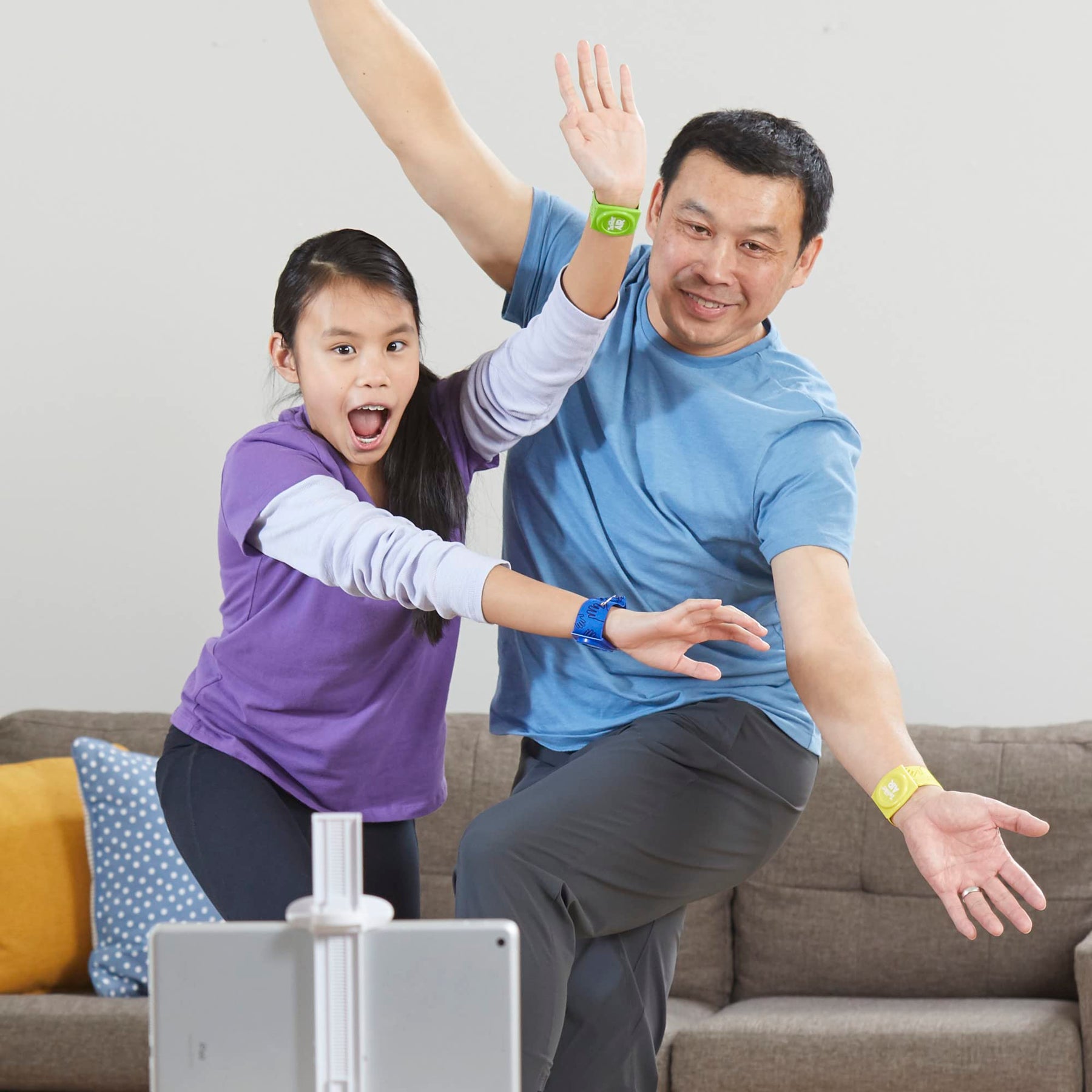 The game includes eight vibrant, stretchy bands—four for wrists and four for ankles—so up to two players can join in. Match your colored bands to the on-screen targets as they appear. Reach, swipe, clap, and strike hilarious poses in time with the music to earn points. The more spots you hit, the higher your score!