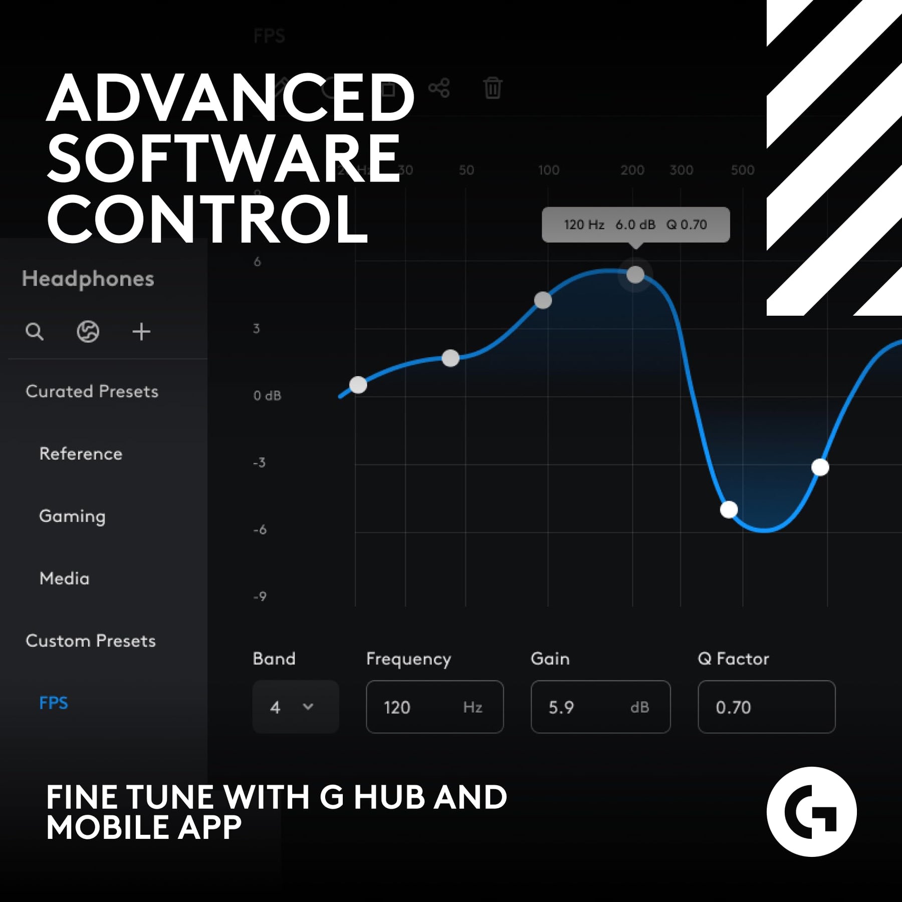 • Customize your audio experience with advanced controls via G HUB and the mobile app, including 10-band parametric EQ, mic monitoring, noise reduction, and stream output mixing