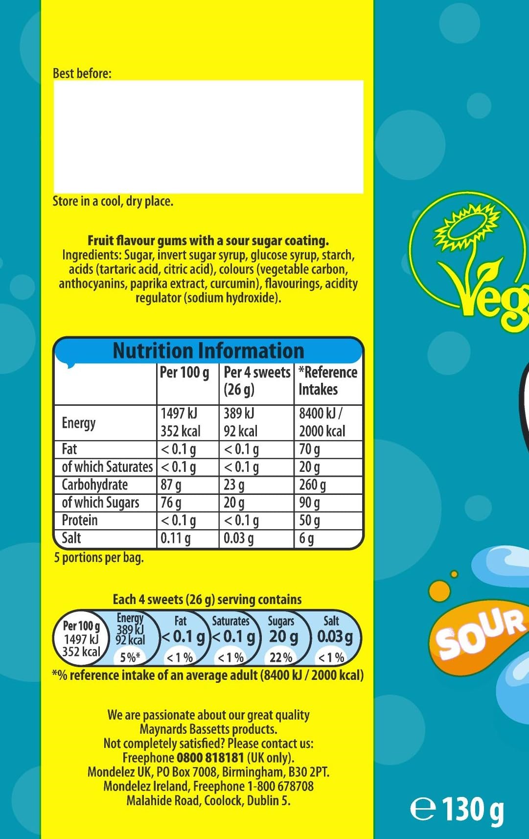Ingredients: Sugar, Invert Sugar Syrup, Glucose Syrup, Starch, Acids (Tartaric Acid, Citric Acid), Colours (Vegetable Carbon, Anthocyanins, Paprika Extract, Curcumin), Flavourings, Acidity Regulator (Sodium Hydroxide). Product of Mondelez UK.