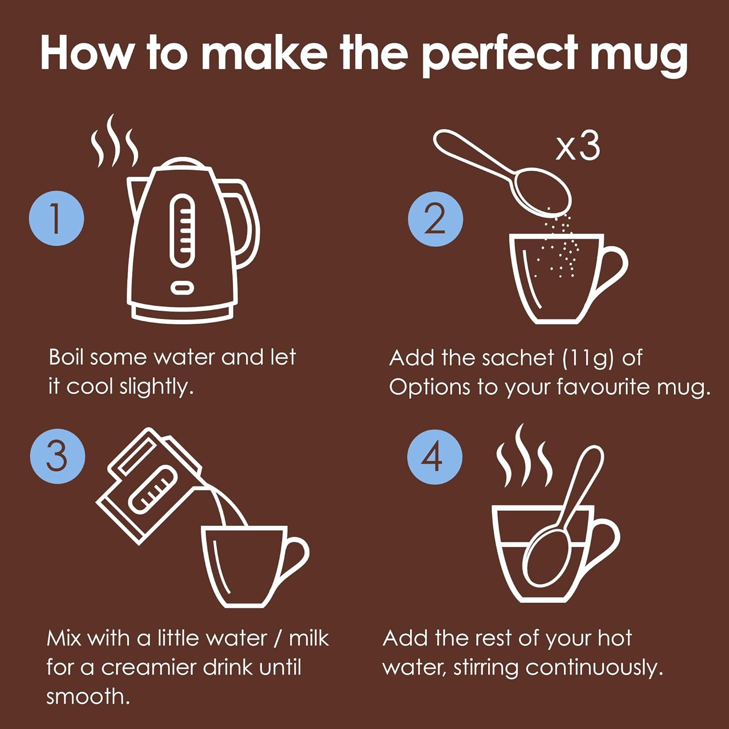 Indulge in a rich and creamy mint-flavoured instant hot chocolate with Twinings Options Belgian Mint Chocolate Sachets. Expertly crafted with real Belgian chocolate (6%) and natural mint flavouring, this decadent drink delivers a smooth, satisfying taste with only 38 calories per cup. Ideal for those seeking a lighter hot chocolate option without compromising on luxury or flavour.