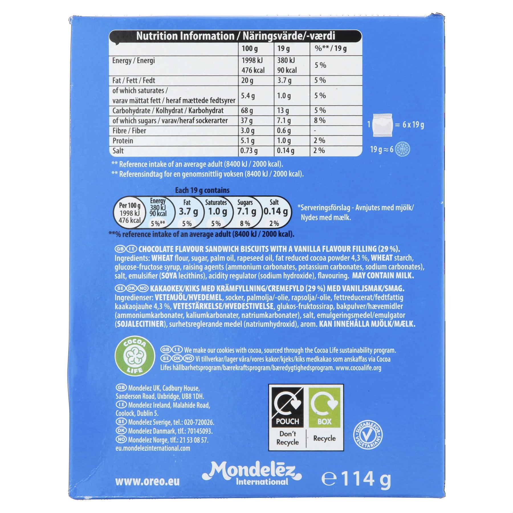 Enjoy the classic Oreo flavor in a convenient mini size! Each of the 6 mini bags contains bite-sized chocolate sandwich biscuits with the iconic creamy vanilla filling, perfect for on-the-go snacking, lunchboxes, or sharing with family and friends.