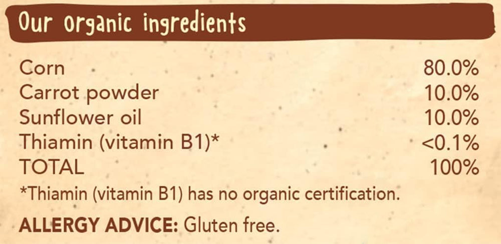 Ingredients: Corn, Carrot powder, Sunflower oil, Thiamin (vitamin B1)*