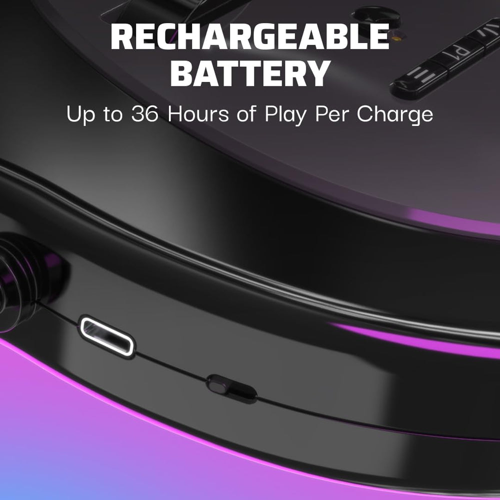 - 30-foot low latency wireless connection with up to 36 hours of play per charge via built-in rechargeable battery