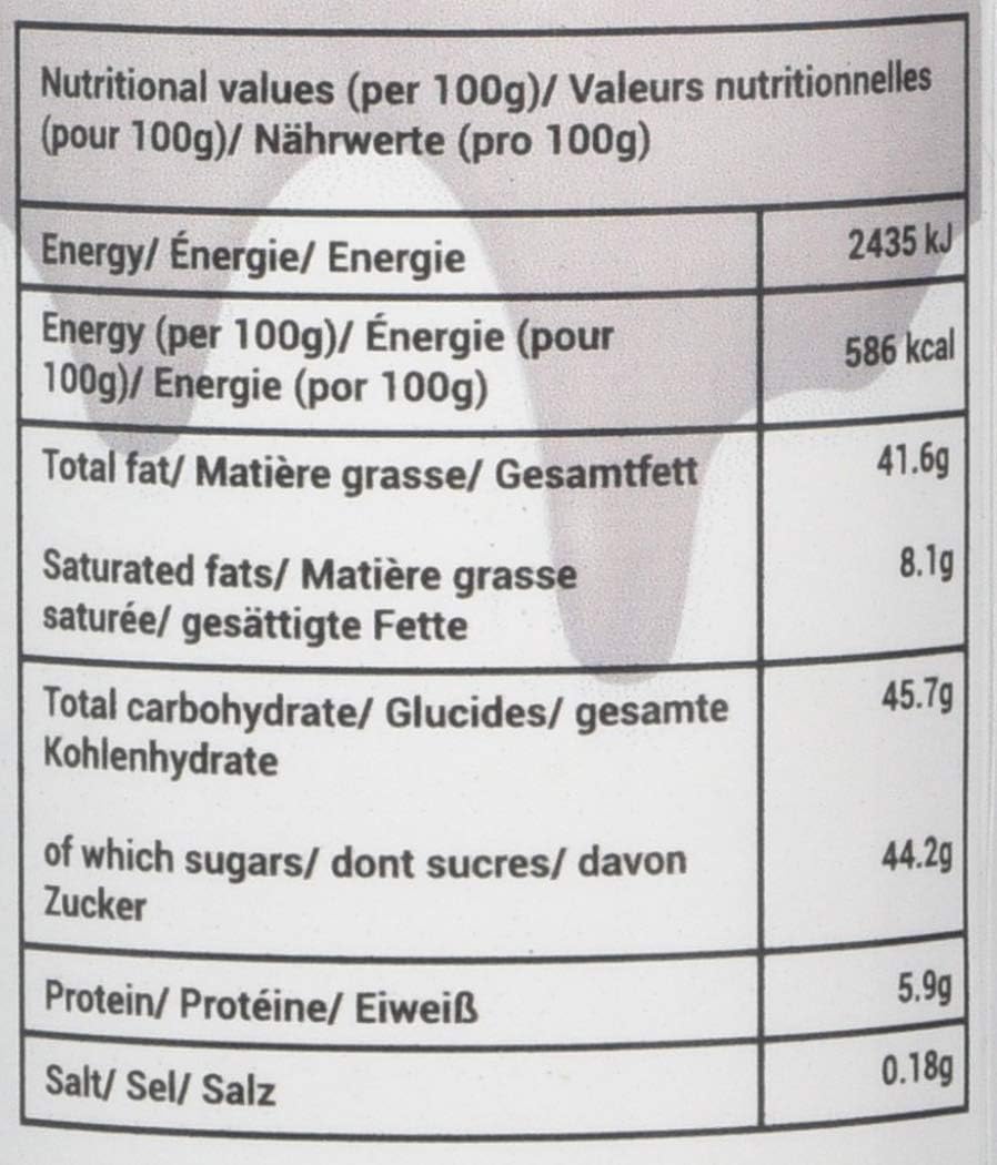 • Ingredients: Sugar, sunflower oil, chocolate, 15% whole MILK powder, fat-reduced cocoa, emulsifier (SOYA lecithin), natural flavouring, antioxidant (rosemary extract)