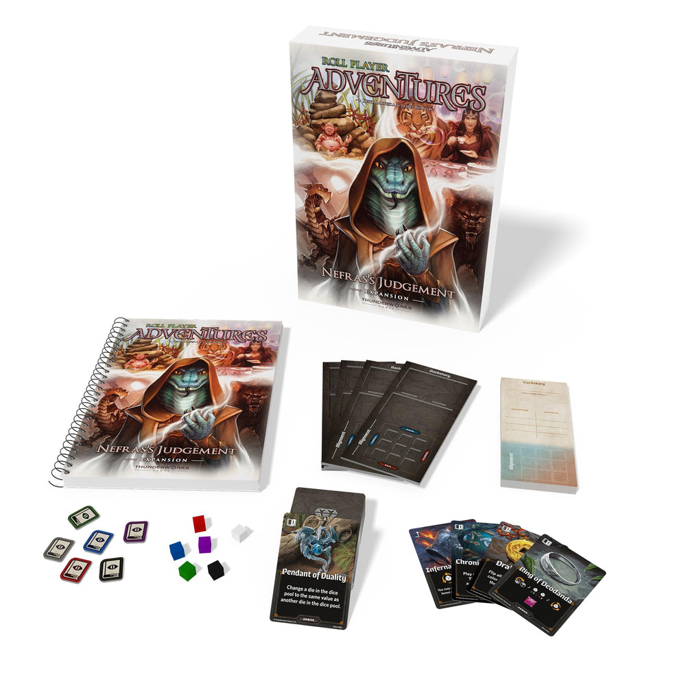 In the Nefras's Judgement expansion for Roll Player Adventures, each player explores one of 41 unique backstory quests, uncovering their character's alignment through pivotal choices woven into the campaign's narrative. Set in the world of Roll Player, this cooperative storybook board game expansion challenges players to navigate moral dilemmas, shape their hero's destiny, and influence the fate of the land of Nalos. Nefras, the snake-faced goddess of judgment, observes all souls to assess their true nature and bestow her final judgment—no act goes unnoticed.
