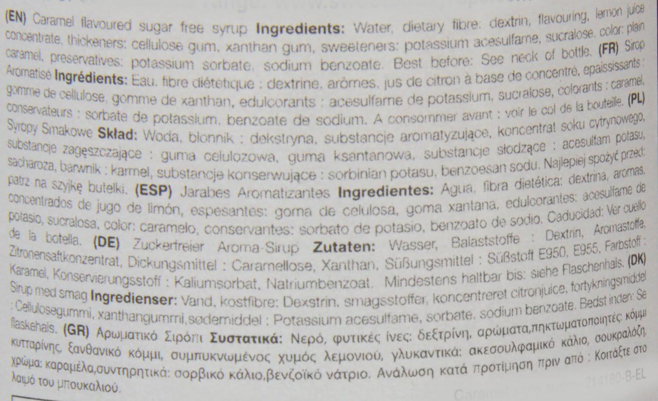 - Ingredients: Water, dietary fibre (dextrin), flavouring, lemon juice from concentrate, thickeners (cellulose gum, xanthan gum), sweeteners (potassium acesulfame, sucralose), colour (plain caramel), preservatives (potassium sorbate, sodium benzoate)
