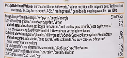 - Nutritional Information (per 100g): Energy 373kJ/89kcal, Fat 2.4g (saturates 0.5g), Carbohydrate 12.0g (sugars 4.9g), Fibre 3.8g, Protein 2.9g, Salt 0.43g