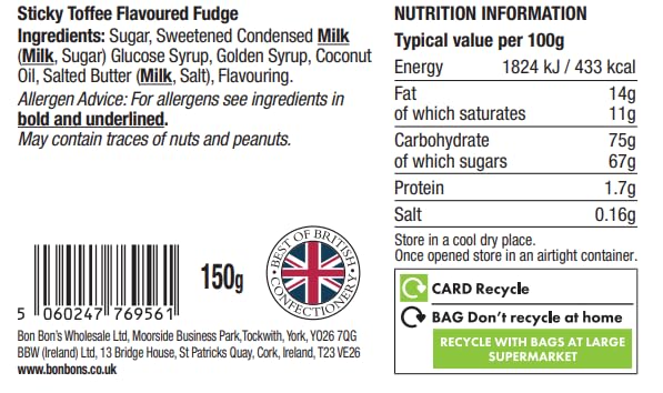 Bon Bon's Gourmet collection brings together premium, handcrafted confectionery from artisan producers across the UK and Europe. This Sticky Toffee Fudge is a rich, indulgent treat made in small batches using high-quality ingredients, reflecting the tradition of classic British sweet-making.