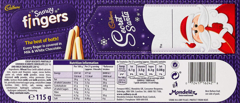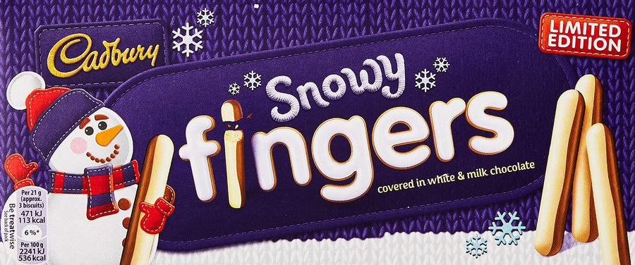 Celebrate the season with Cadbury Snowy Fingers – a deliciously festive twist on a classic favourite. Each crunchy biscuit finger is half-dipped in smooth milk chocolate and half in creamy white chocolate, creating a delightful blend of flavours in every bite. Perfect for sharing with family and friends, these Snowy Fingers come in a charming 115g box that’s ideal for Christmas parties, stockings, or festive snack tables. Whether you're gifting, hosting, or simply indulging, Cadbury Snowy Fingers bring a touch of seasonal joy to every moment.