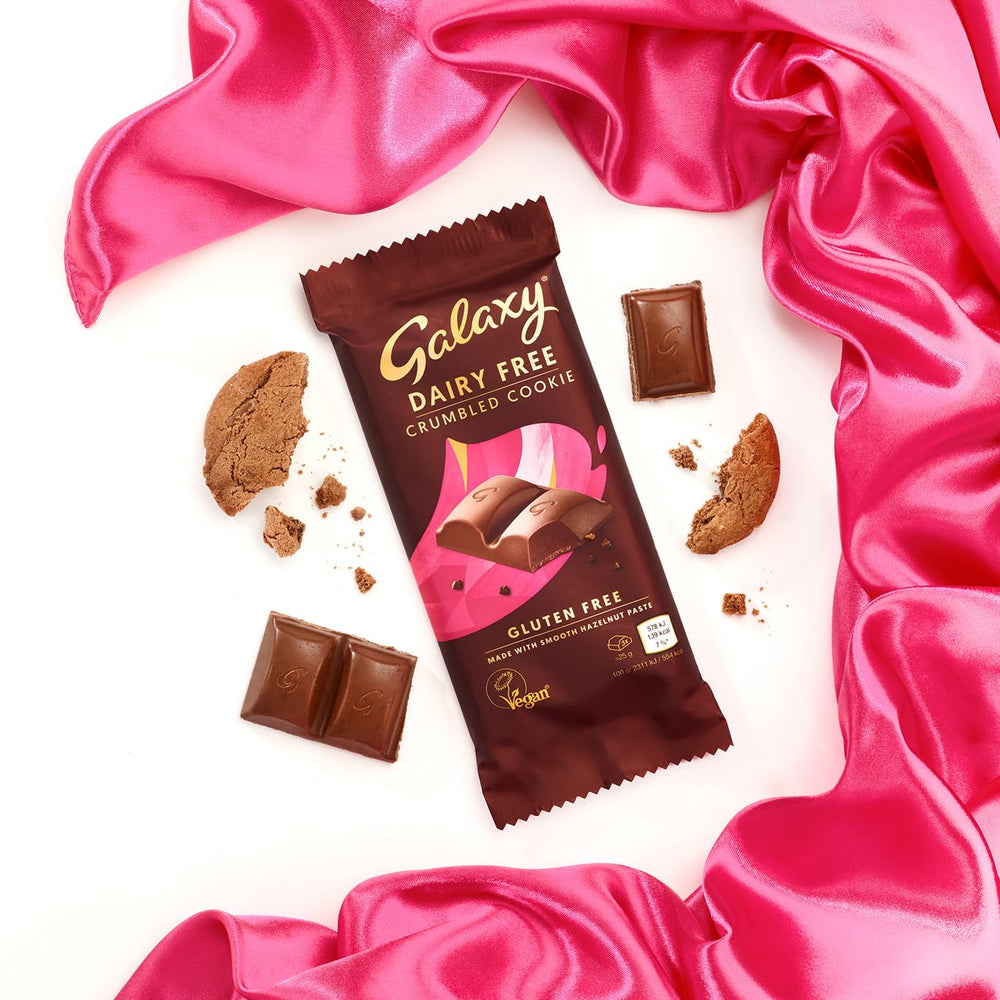 Indulge in the rich, creamy taste of GALAXY Dairy Free Chocolate Bar with Crumbled Cookie, a delicious vegan treat that combines smooth cocoa with creamy hazelnut paste and crunchy cookie pieces. Experience the luxurious texture of milk chocolate without dairy — perfect for vegans and those with dairy sensitivities.