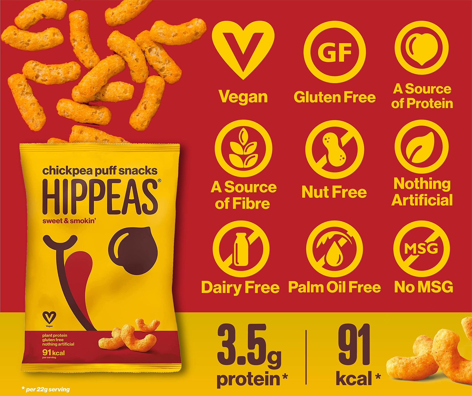 Indulge in the bold, smoky flavor of Hippeas Sweet & Smokin' Chickpea Puffs – a deliciously crunchy, plant-powered snack that’s as good for you as it is for the planet. Made from 39% chickpea flour and baked, not fried, these vegan crisps deliver a satisfying crunch without the guilt.