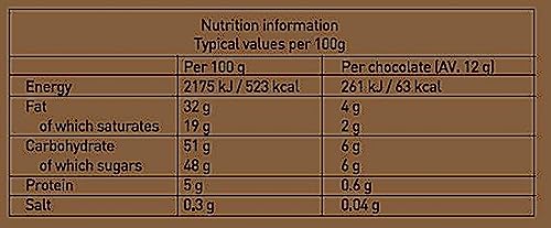• Contains: Dark, Milk, and White Chocolate (with SOYA Lecithin), MILK, HAZELNUTS, ALMONDS, SULPHUR DIOXIDE, BARLEY, and natural flavorings