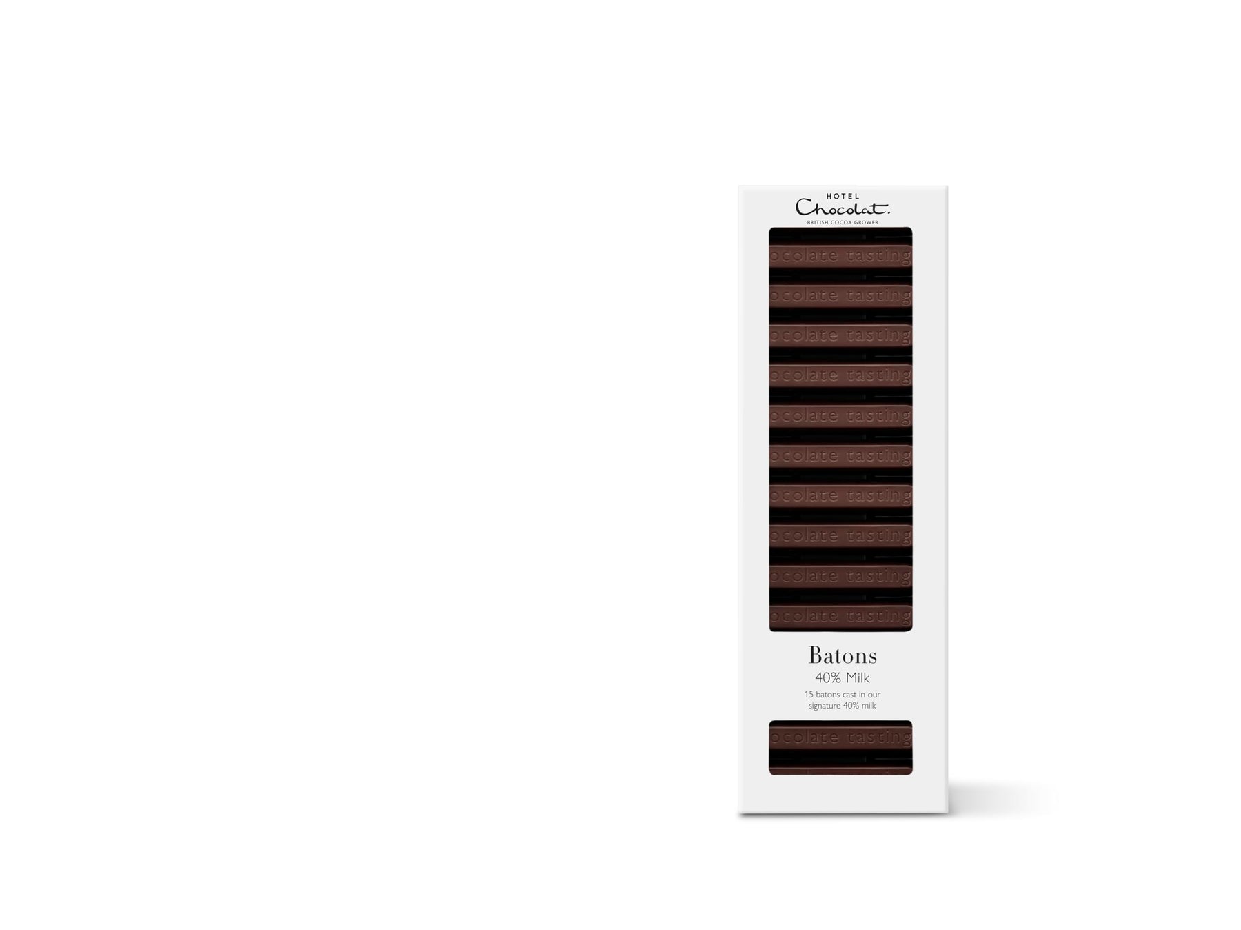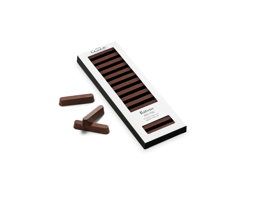 - 15 solid milk chocolate batons with 40% cacao content