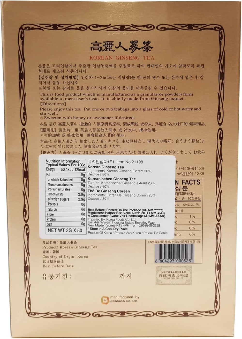 Korean Red Ginseng Tea powder is made from the finest Korean Red Ginseng roots, offering a delicious and convenient way to enjoy the traditional health benefits associated with red ginseng. This product is manufactured by combining concentrated extract from Korean Red Ginseng roots with glucose using a low-temperature process to preserve potency. Simply steep one sachet in hot water to enjoy a soothing, revitalizing tea. Add honey or your preferred sweetener for enhanced flavor.