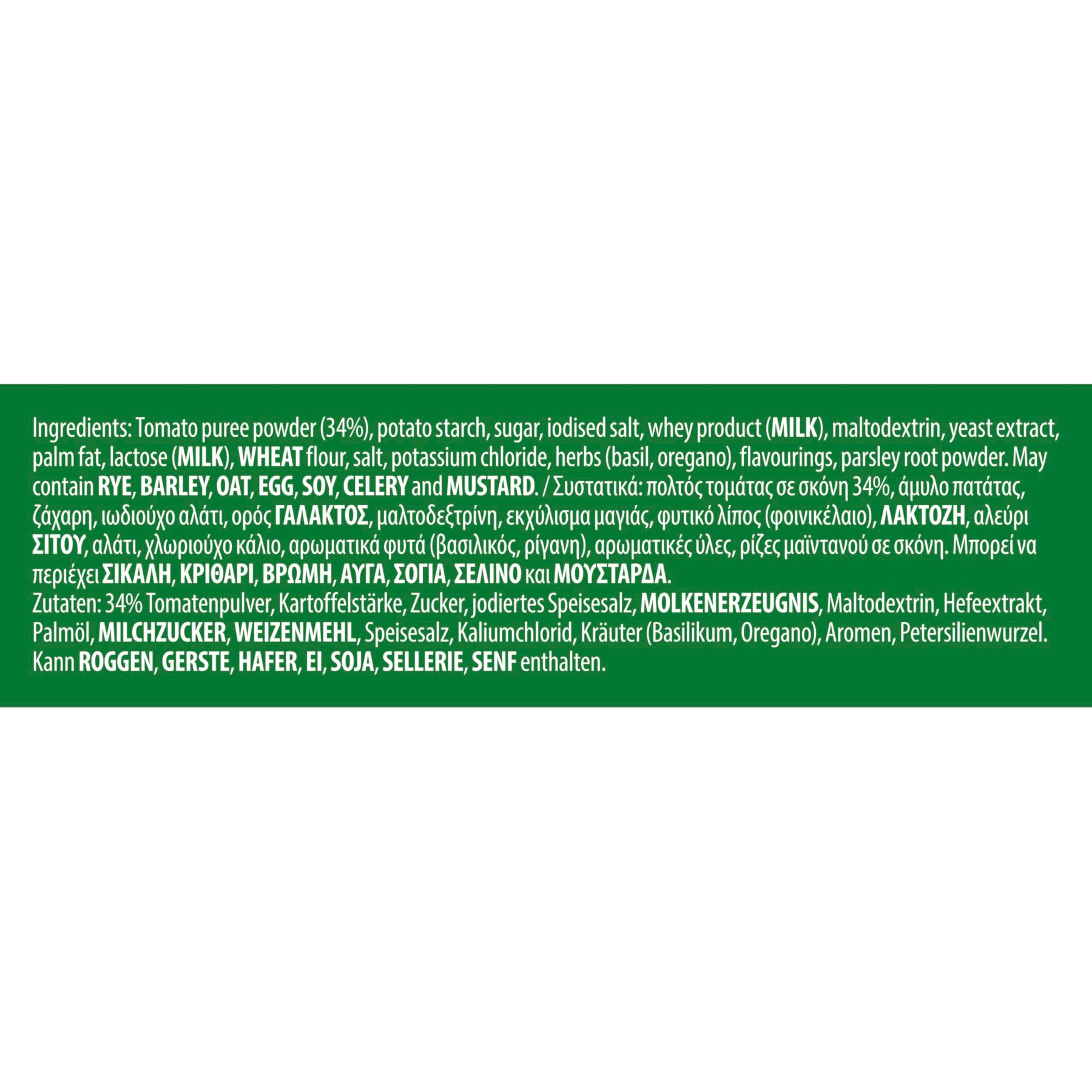 - Ingredients: Tomato puree powder (34%), potato starch, sugar, iodised salt, whey product (MILK), maltodextrin, yeast extract, palm fat, lactose (MILK), WHEAT flour, salt, potassium chloride, herbs (basil, oregano), flavourings, parsley root powder. [1] From sustainable agriculture