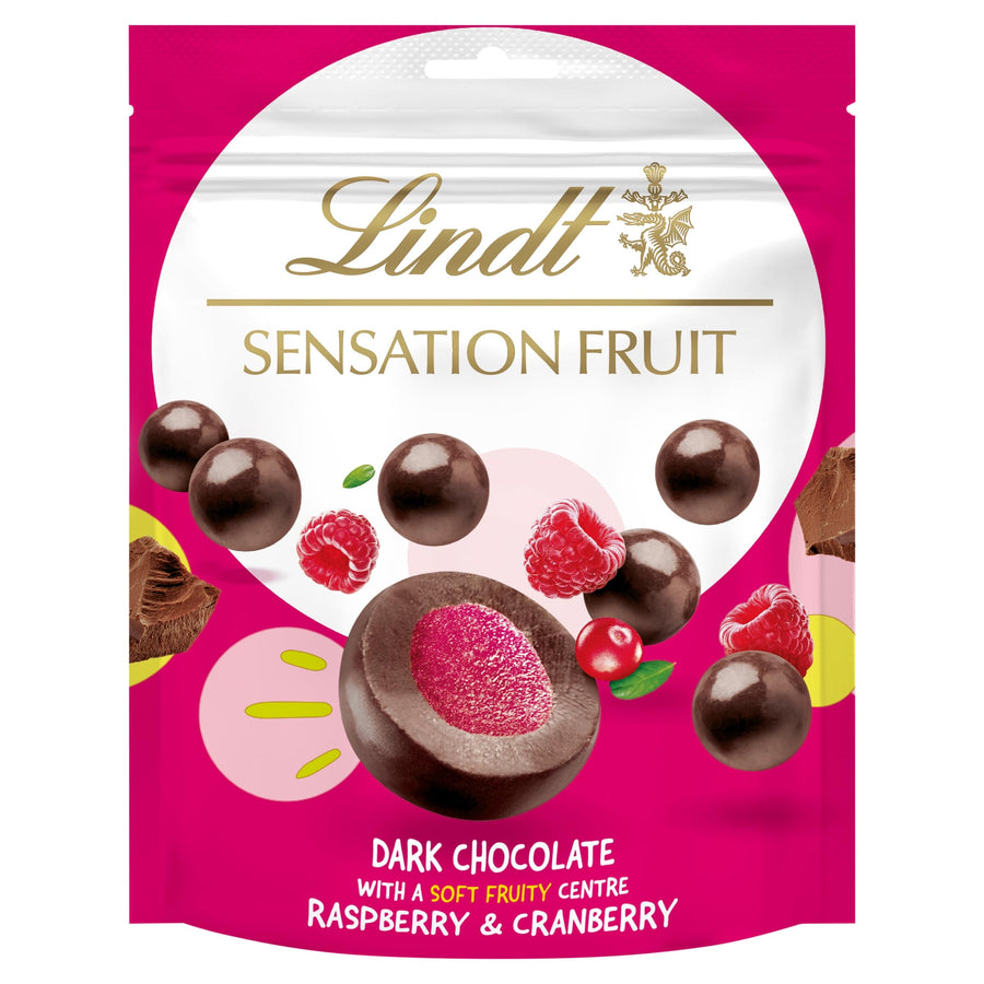 Indulge in Lindt Fruit Sensation Raspberry and Cranberry, a premium confectionery blend of juicy, soft raspberry and vibrant cranberry jellies enveloped in rich, intense dark chocolate with a minimum of 47% cocoa solids. Crafted by Lindt Master Chocolatiers using the finest ingredients, this treat delivers a sophisticated balance of sweet-tart fruit and smooth chocolate.