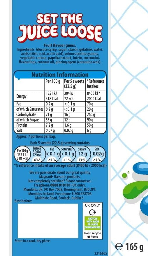 - Ingredients: Glucose Syrup, Sugar, Starch, Gelatine, Water, Acids (Citric Acid, Acetic Acid), Colours (Anthocyanins, Vegetable Carbon, Paprika Extract, Lutein, Curcumin), Flavourings, Coconut Oil, Glazing Agent (Carnauba Wax)