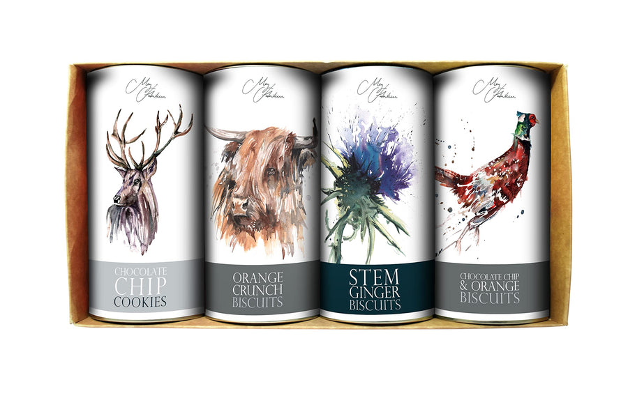 A beautifully designed gift set from Meg Hawkins, featuring four decorative biscuit drums by Farrah's of Harrogate. This collection makes an ideal treat or present, combining charming countryside-themed designs with delicious, premium biscuits.