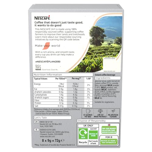 This product is suitable for vegetarians and contains skimmed milk powder, milk proteins, and milk fat. It may contain milk and is not suitable for those with milk allergies. The convenient 8-drink pack offers a quick coffee solution for home, work, or travel.