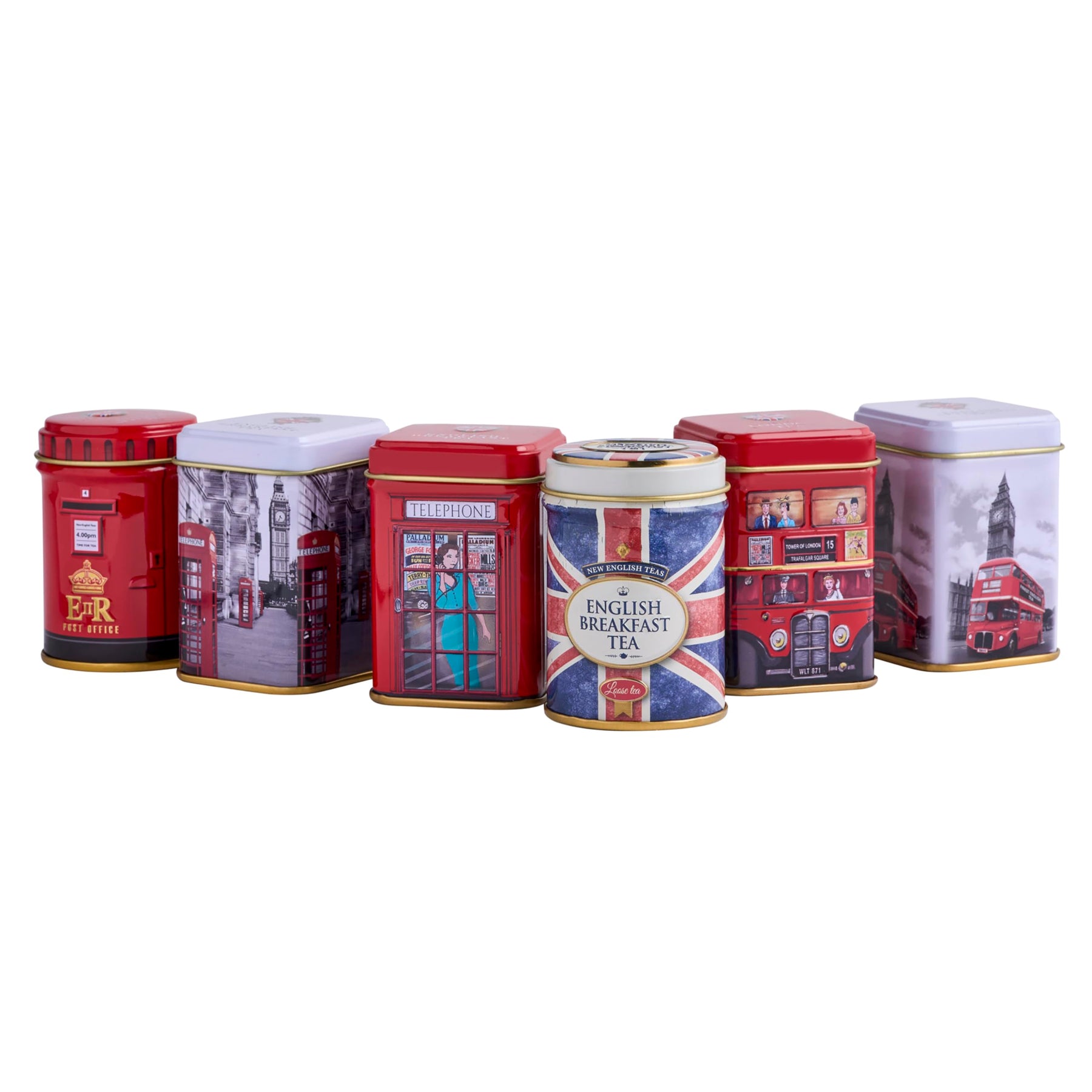 Enjoy the quintessential taste of England with this charming collection of six mini tea tins, each adorned with iconic British imagery including the Union Jack, a red telephone box, and a classic English post box. Perfect for tea lovers and collectors alike, this set brings a touch of London charm to any kitchen or living space.