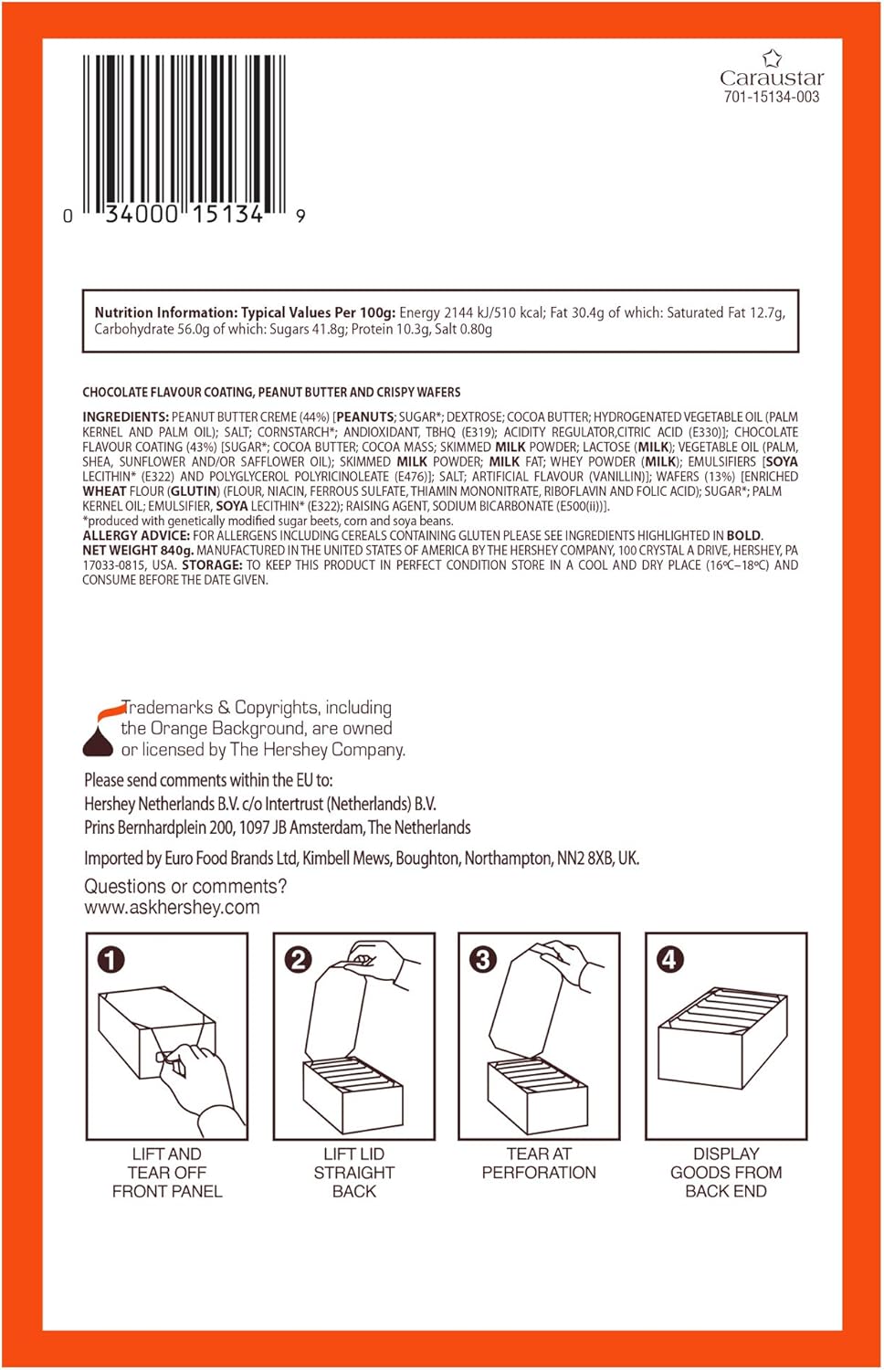• Ingredients include peanut butter crème (44%), milk chocolate (35%), chocolate-flavoured coating (8%), and wafers (13%)