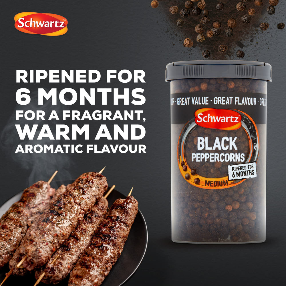 Schwartz Medium Black Peppercorns offer a balanced blend of mild heat and bold flavor, ripened for 6 months to deliver a spicy kick and versatile hot biting taste. These premium peppercorns are ideal for enhancing both everyday meals and gourmet dishes.