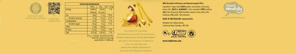 • Ingredients: Sugar, Whole MILK Powder, Cocoa Butter, Cocoa Mass, Honey (3%), MILK Fat, ALMONDS (1.6%), Emulsifier (SOYA Lecithins), EGG White, Flavouring