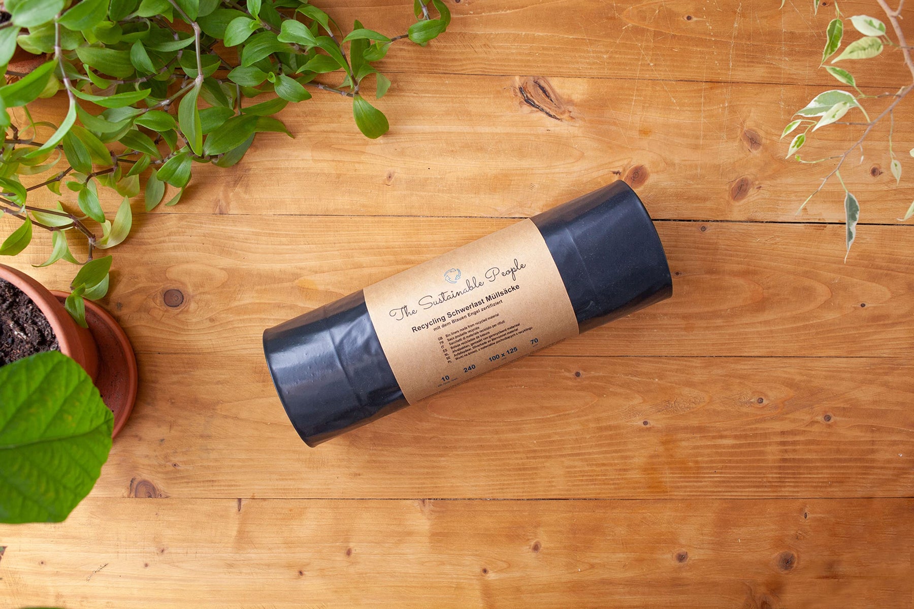 Heavy-duty recycled bin bags made from at least 90% post-consumer waste (PE), ideal for reliable waste disposal in homes, gardens, and businesses. Certified with the Blue Angel eco-label (uz30a), these 240-liter bags are manufactured in the EU using significantly less CO₂ than virgin plastic production. Each bag measures 100 cm width (200 cm circumference) by 125 cm height, fitting standard 240 L bins.