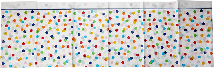 Add a burst of color to your celebrations with this vibrant rainbow polka dot plastic tablecloth. Designed to fit most rectangular tables, this 137cm x 213cm (7ft x 4.5ft) table cover provides full protection against spills, stains, and crumbs, making it ideal for birthday parties, baby showers, pride events, and more.