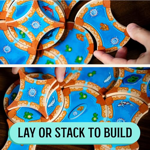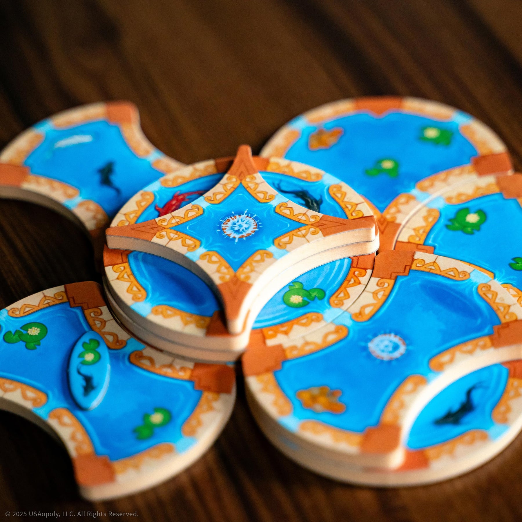 • Players take turns moving tokens clockwise around the central board to collect tiles and build upward and outward, ensuring water flows through all levels to avoid dead zones