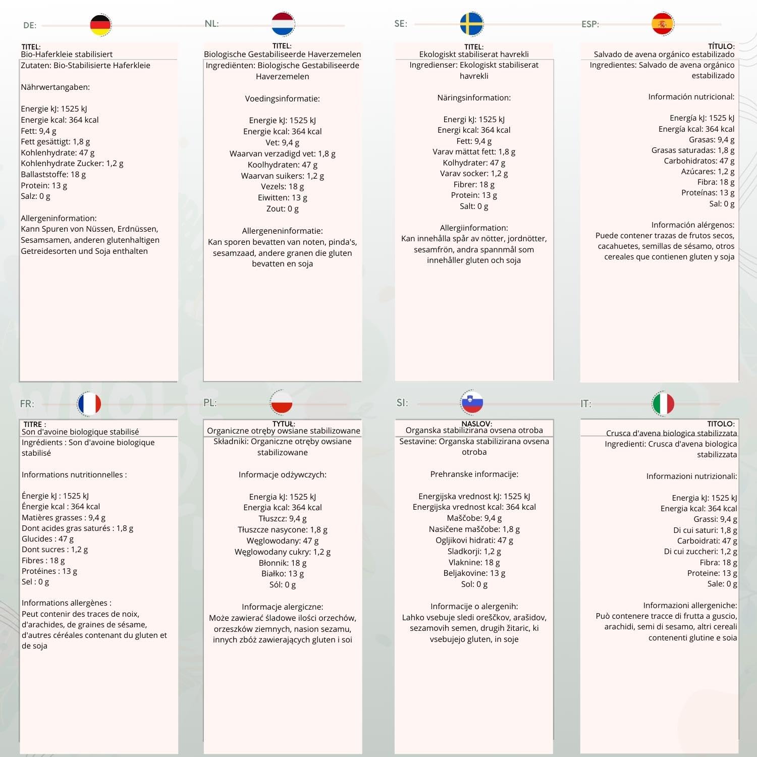 Package contains: Organic Stabilised Oat Bran. May contain traces of nuts, peanuts, sesame seeds, other cereals containing gluten, and soy. Always read the ingredients on the packaging if you have allergies or dietary requirements.