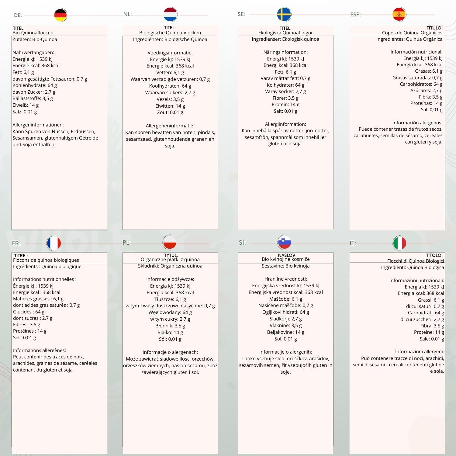• May contain traces of nuts, peanuts, sesame seeds, cereals containing gluten, and soya
